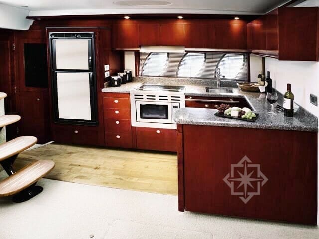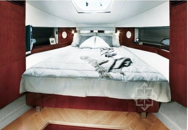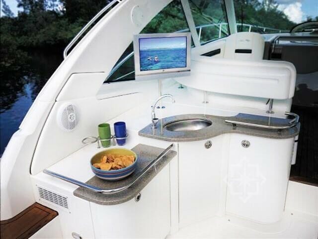 In addition to a large cabin, solid-surface countertops, handcrafted hardwood cabinets and trim with cherry-wood finishes. Not to mention a comfortable Salon with L shaped leather sofa, Galley fully equipped with a microwave/convection oven, two-burner stove and full sized refrigerator. This ingeniously designed and beautiful vessel is nothing short of inspired amongst the various yacht charters. For entertainment a 26″ LCD flatscreen TV and DVD player is included. The entertainment center is beautiful with etched glass and stainless-steel accents, along with a Sirius® Satellite Clarion® stereo system with CD changer and amplifier/speaker system.