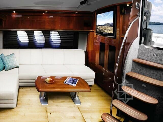 The exterior of the yacht features a sunpad at the bow, Tv, Wet Bar, U shaped seating and a retractable sunpad at the aft as well. This yacht is the perfect size and comfort for a small group looking to cruise around the Miami waters.