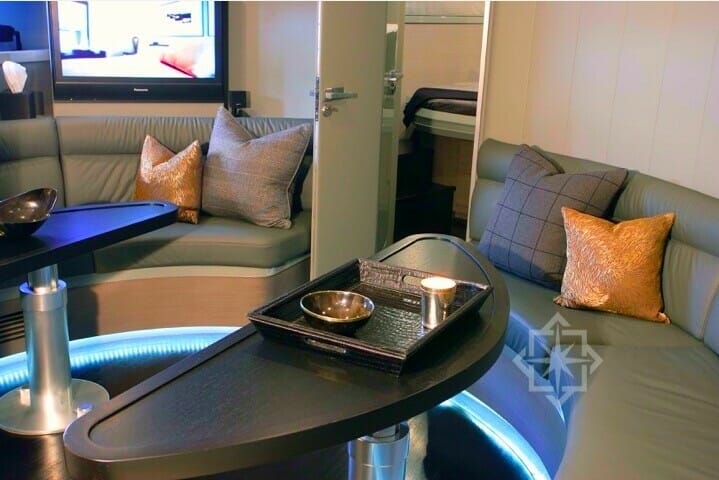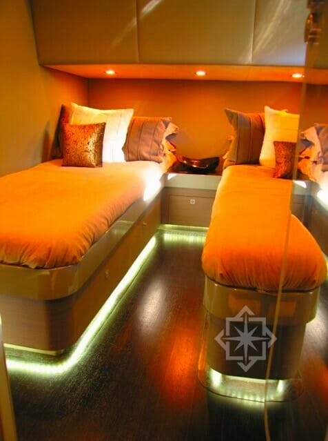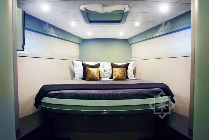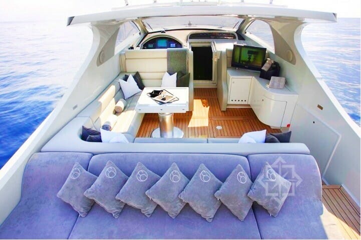 The 55′ Otam is the ultimate performance cruiser, which offers speed, European style and comfort like nothing else out there on the water. Make this your yacht rental Miami choice. Experience the speed this magnificent vessel has to offer with its twin arneson drives which go up to 65 MPH! Outside, the yacht has a small kitchen with wet bar and a BBQ. Your guests will have a great experience aboard this vessel which offers a spacious cockpit, outdoor seating and large sunpad perfect for entertaining and sunbathing.