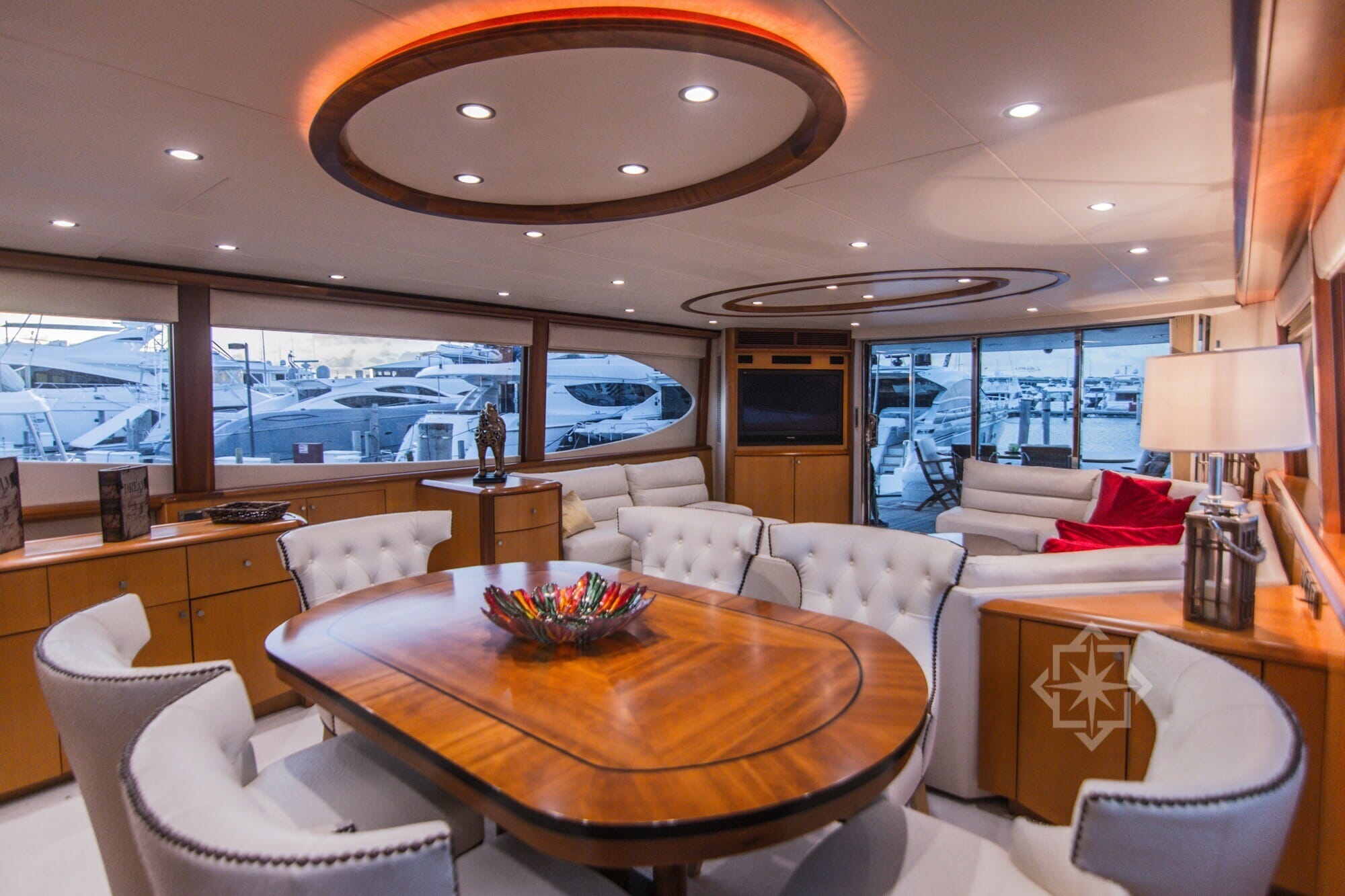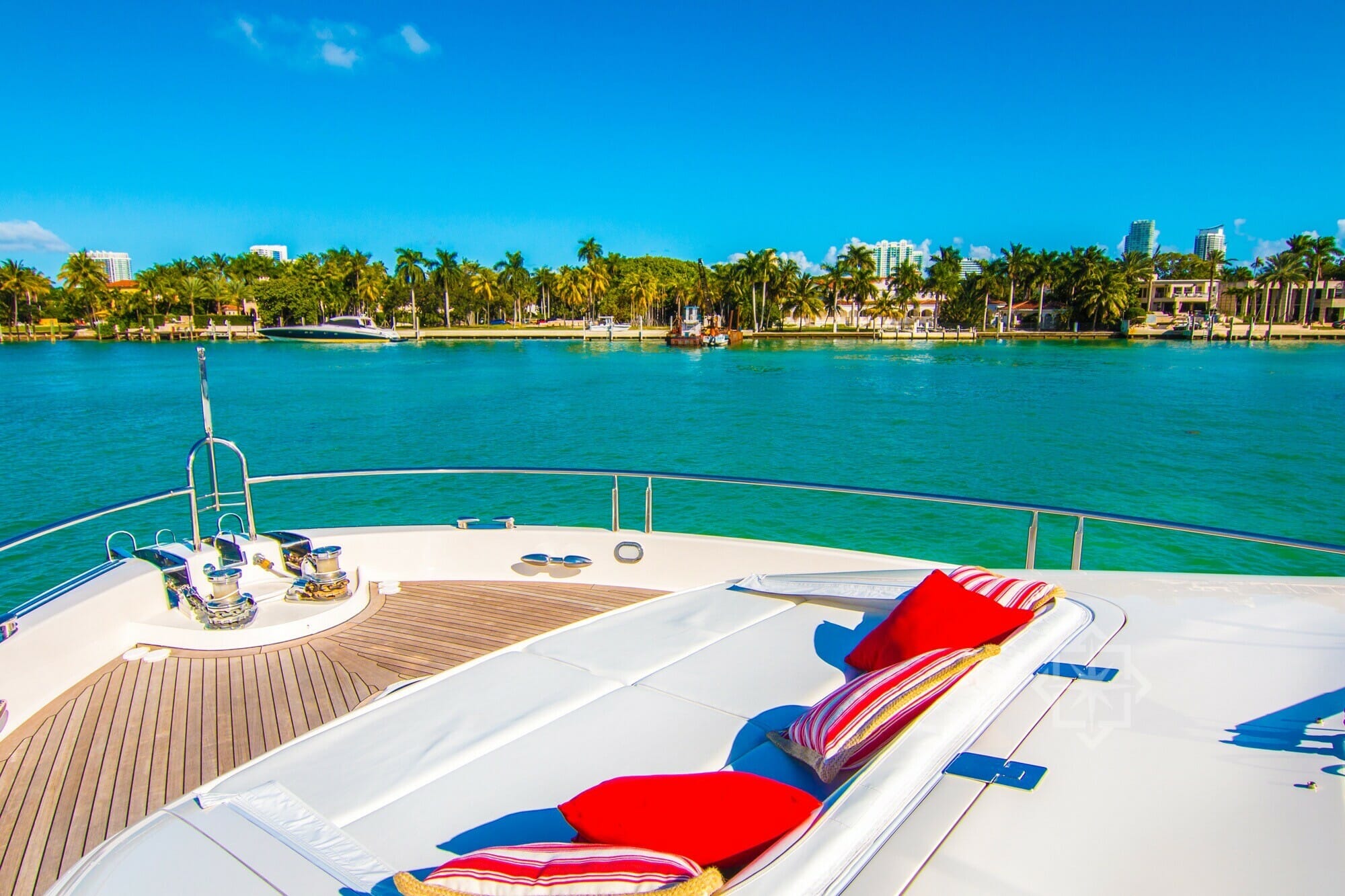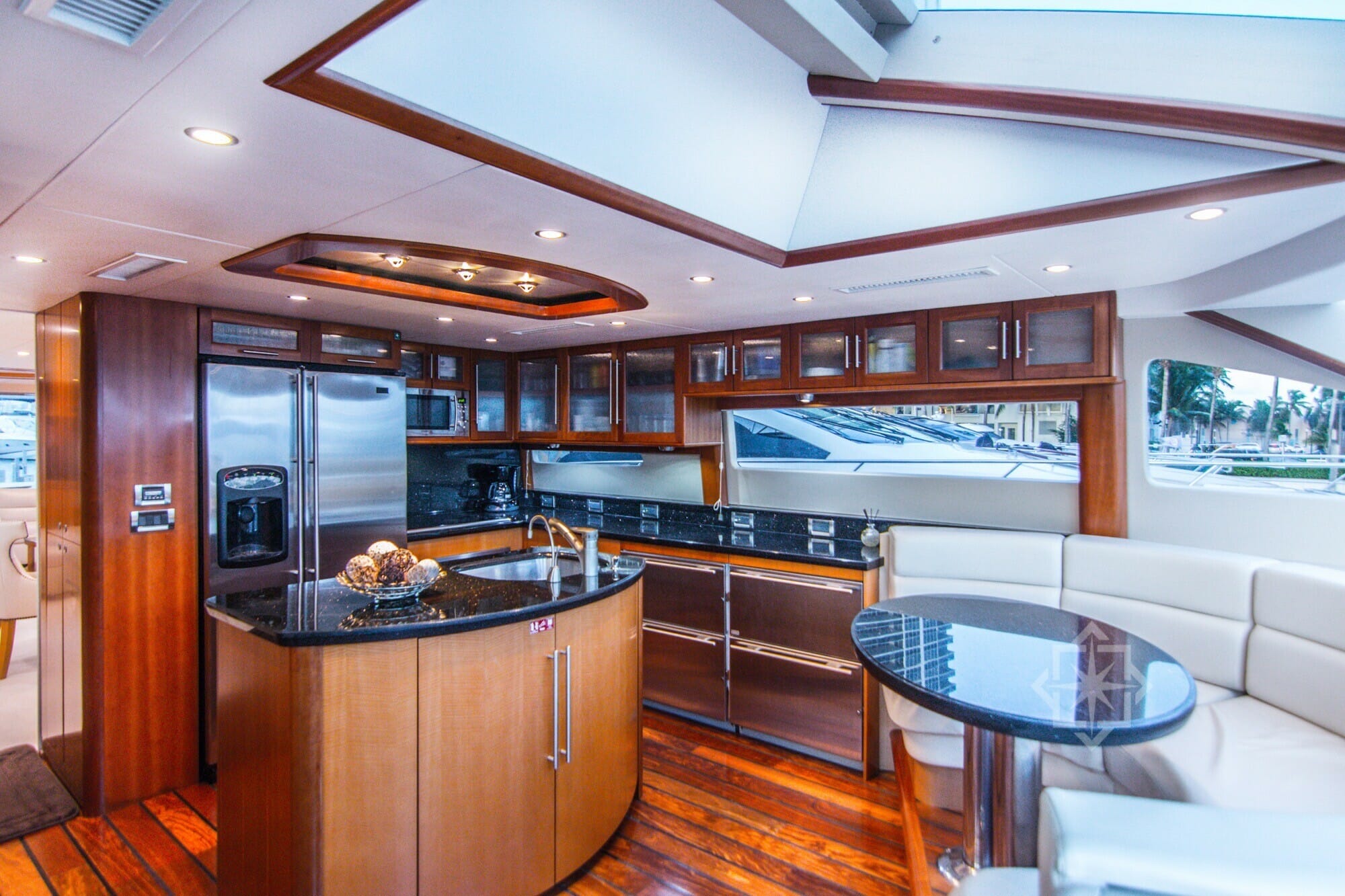 For total luxury, choose the 84 foot Lazzara. This yacht is the only one to ever achieve an MCA & Coast Guard certification. You and your guests will definitely appreciate all the amenities this yacht has to offer. A walk around deck and spacious interior make this boat feel much larger than its size. Let your worries dissolve in the Spa. Our crew will satisfy your thirst at the full wet bar. And you can hire a chef to cook you a fabulous meal and feast on delights cooked on the BBQ while lounging and soaking in the rays. The salon holds a large dining room table, luxurious cream colored sofas and loveseats, and grand picture windows for stunning 360 degree views. The full galley features a center kitchen island, stainless steel appliances, and a seating area with a leather sofa for guests.