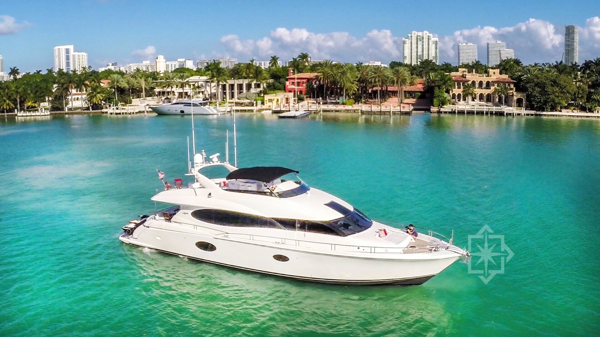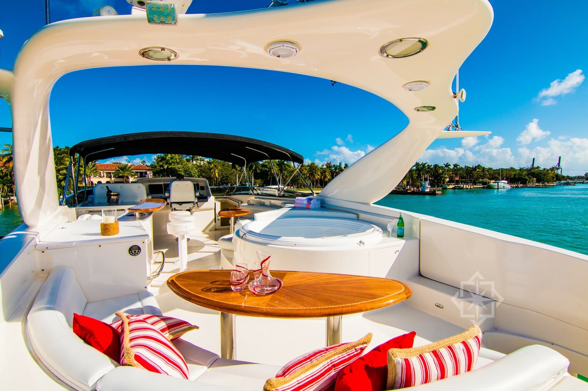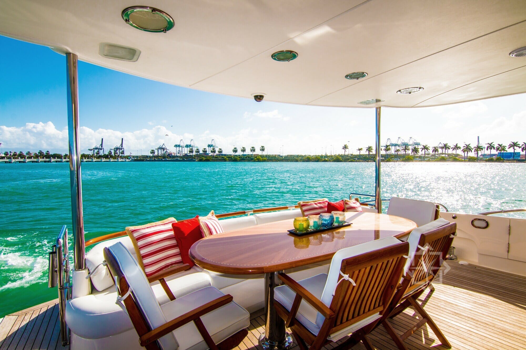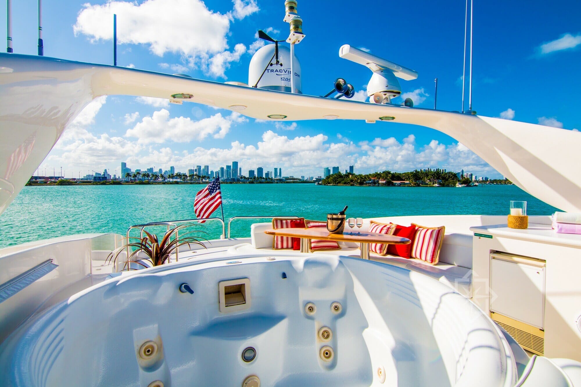 For total luxury, choose the 84 foot Lazzara. This yacht is the only one to ever achieve an MCA & Coast Guard certification. You and your guests will definitely appreciate all the amenities this yacht has to offer. A walk around deck and spacious interior make this boat feel much larger than its size. Let your worries dissolve in the Spa. Our crew will satisfy your thirst at the full wet bar. And you can hire a chef to cook you a fabulous meal and feast on delights cooked on the BBQ while lounging and soaking in the rays. The salon holds a large dining room table, luxurious cream colored sofas and loveseats, and grand picture windows for stunning 360 degree views. The full galley features a center kitchen island, stainless steel appliances, and a seating area with a leather sofa for guests.