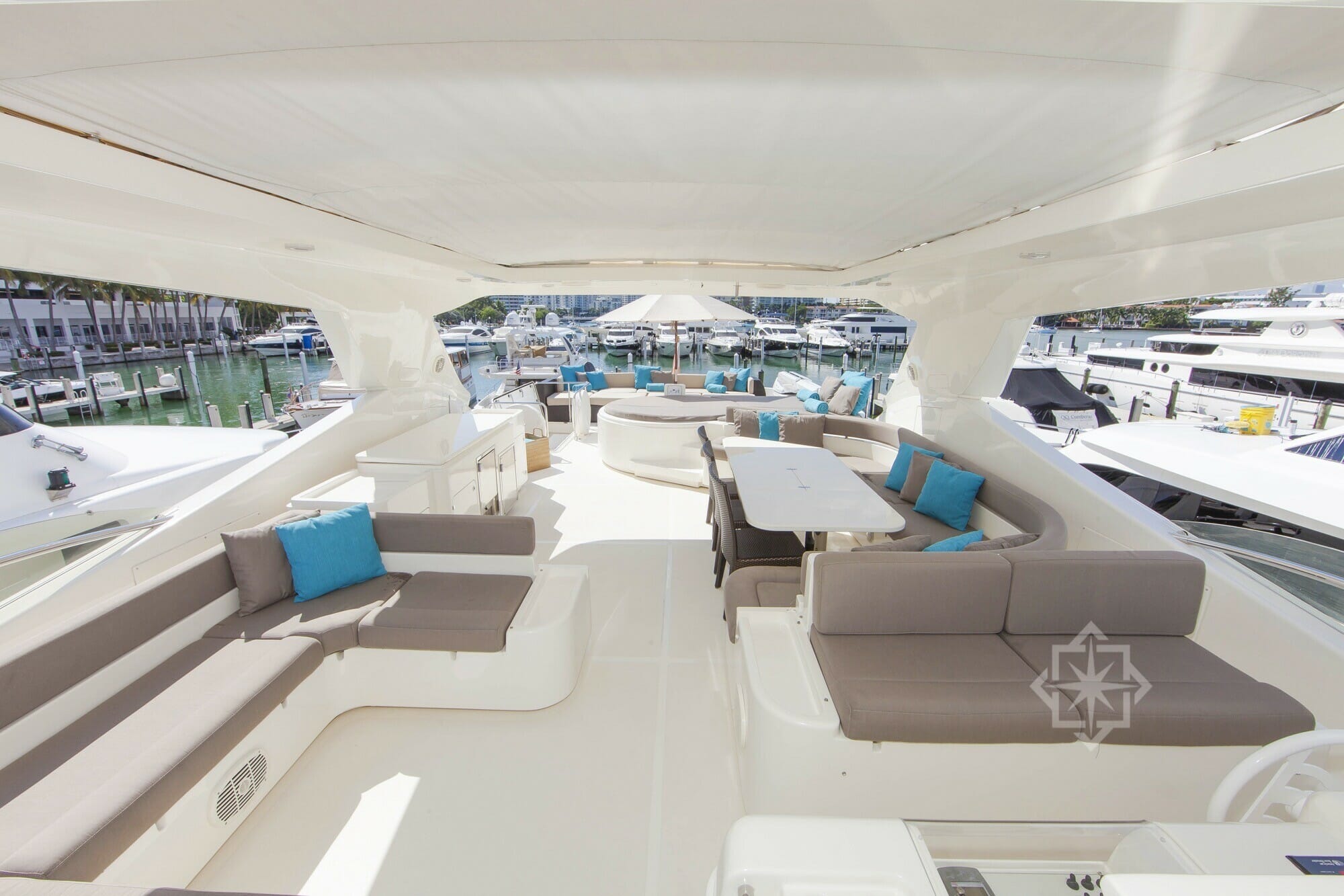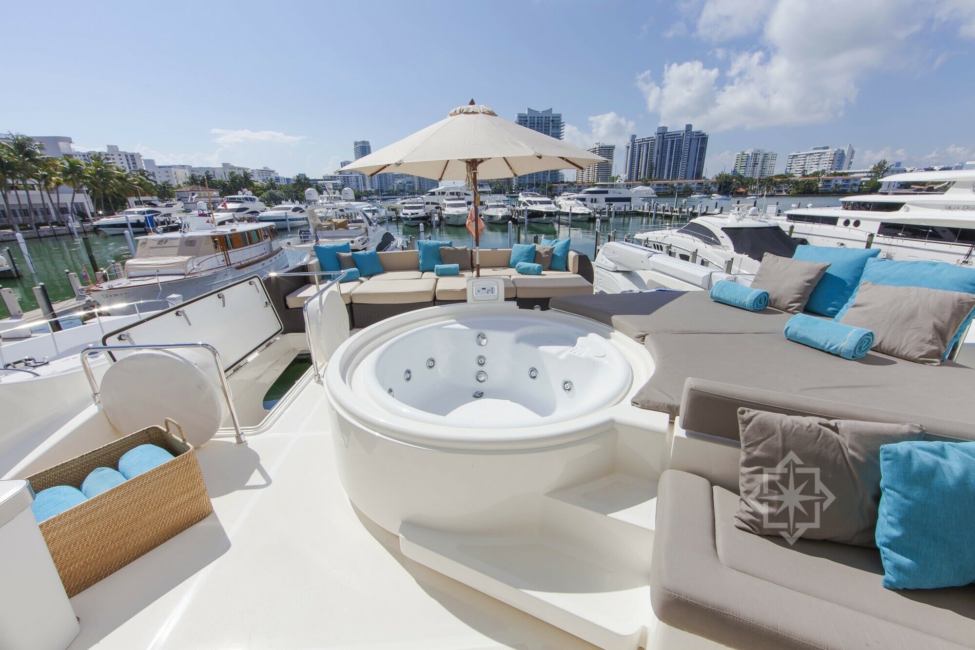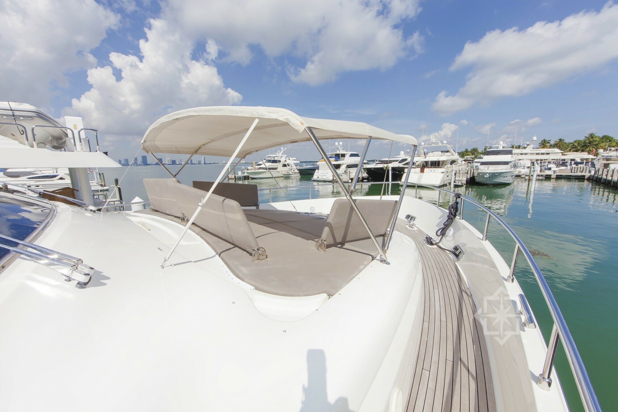 This stunning yacht is a true Queen of the seas, built by one of the most legendary companies in the motor yacht realm – the inimitable Ferretti. The company is known for their passion, innovation, and excellence. Once boarding you will notice at the aft a beautiful round dinning table that comfortably seats 6 guests. Upon exploring the flybridge you are welcome by the inviting jacuzzi or sunpad alongside it for lounging. This yacht is great for entertainment and dinning, since the flybridge also includes a BBQ, wet bar and seating for 10 guests. If you are looking to soak in the sun and scenic views while cruising, at the front of the yacht that there are sunpads as well. For those in the mood for some shade there is a canopy that can be opened by one of our crew.