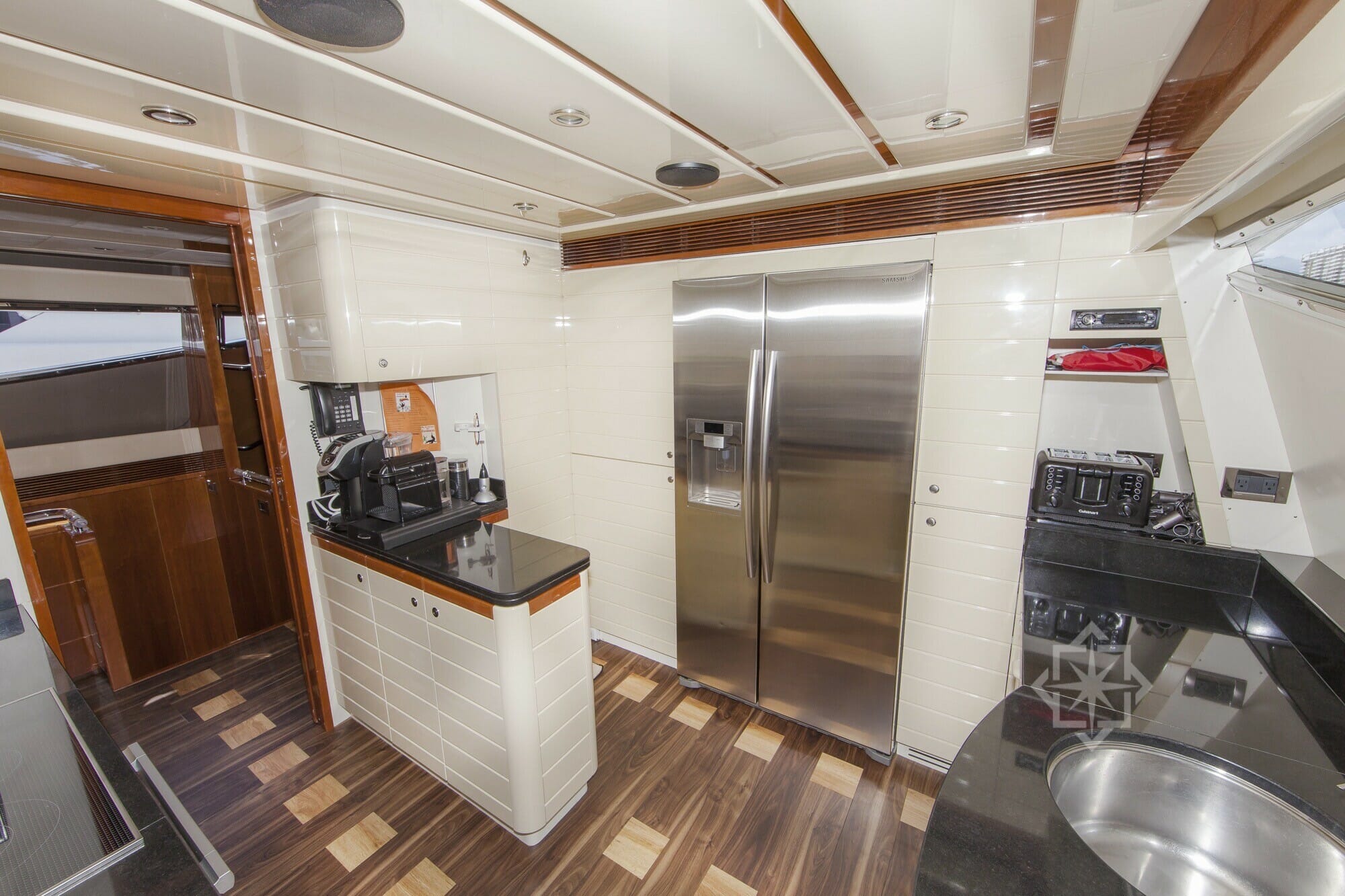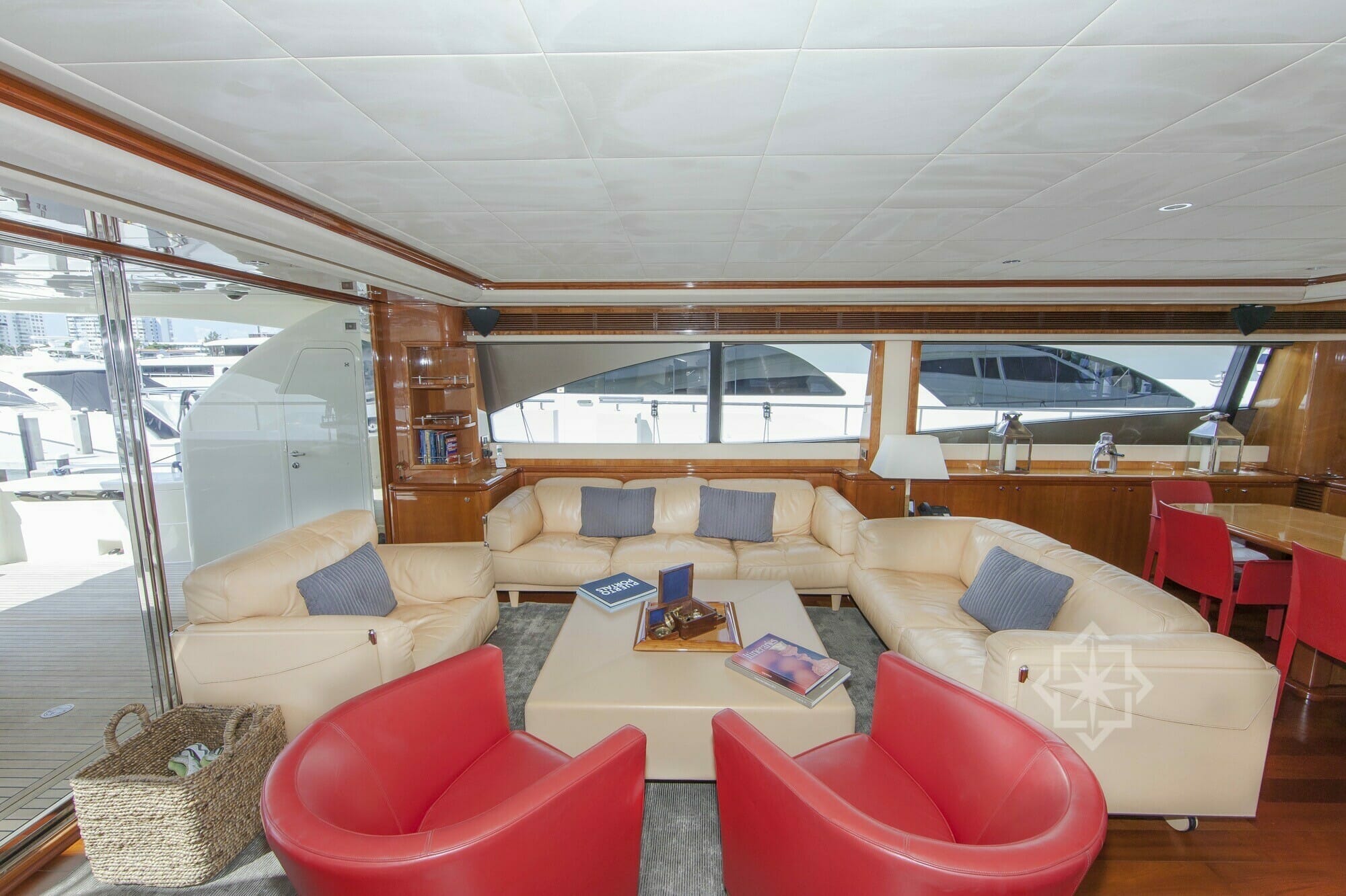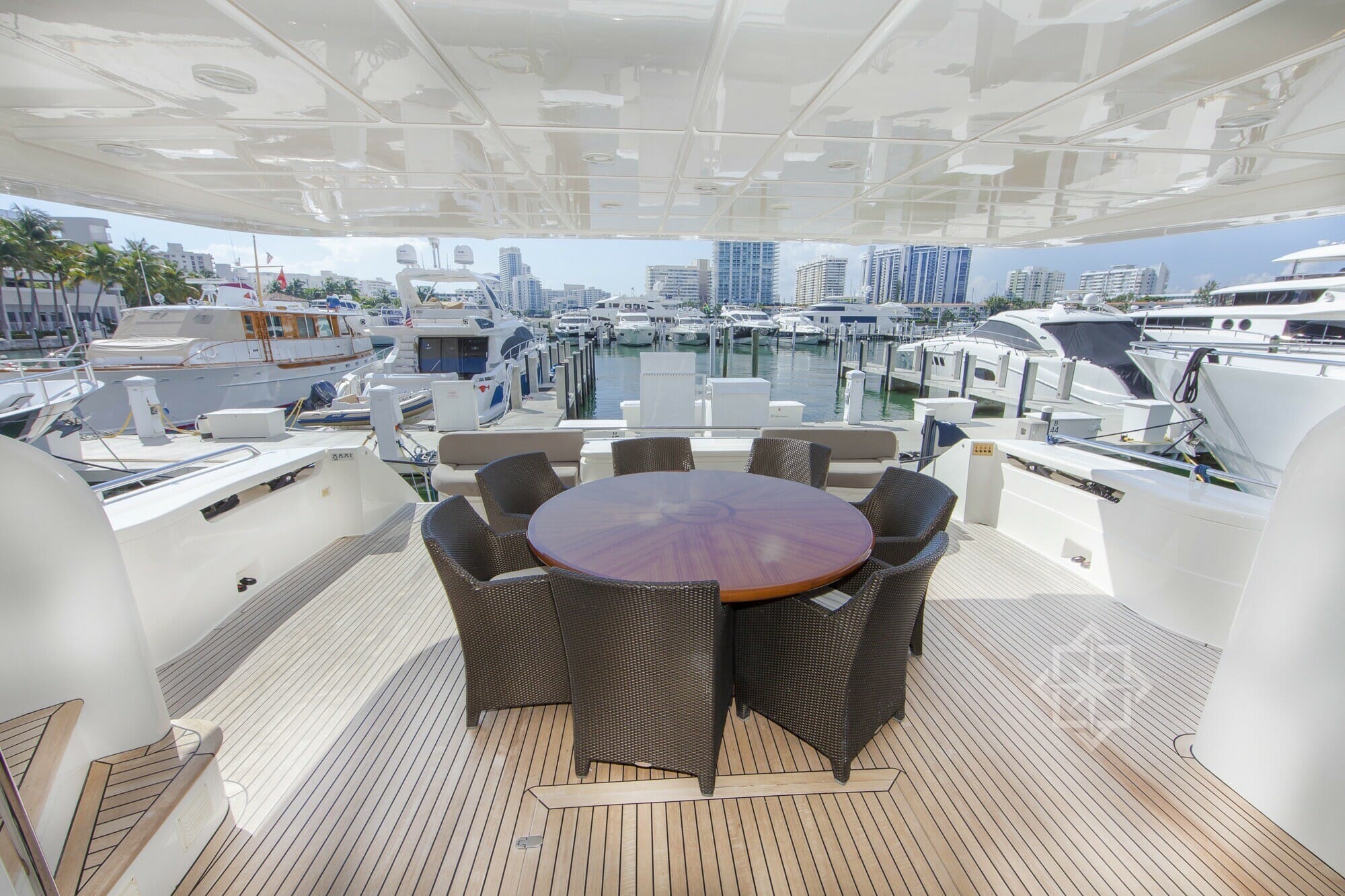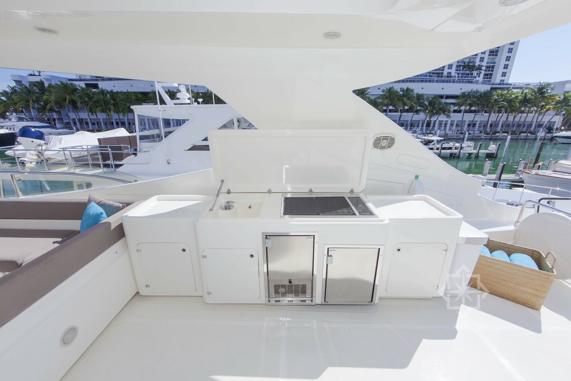 This stunning yacht is a true Queen of the seas, built by one of the most legendary companies in the motor yacht realm – the inimitable Ferretti. The company is known for their passion, innovation, and excellence. Once boarding you will notice at the aft a beautiful round dinning table that comfortably seats 6 guests. Upon exploring the flybridge you are welcome by the inviting jacuzzi or sunpad alongside it for lounging. This yacht is great for entertainment and dinning, since the flybridge also includes a BBQ, wet bar and seating for 10 guests. If you are looking to soak in the sun and scenic views while cruising, at the front of the yacht that there are sunpads as well. For those in the mood for some shade there is a canopy that can be opened by one of our crew.