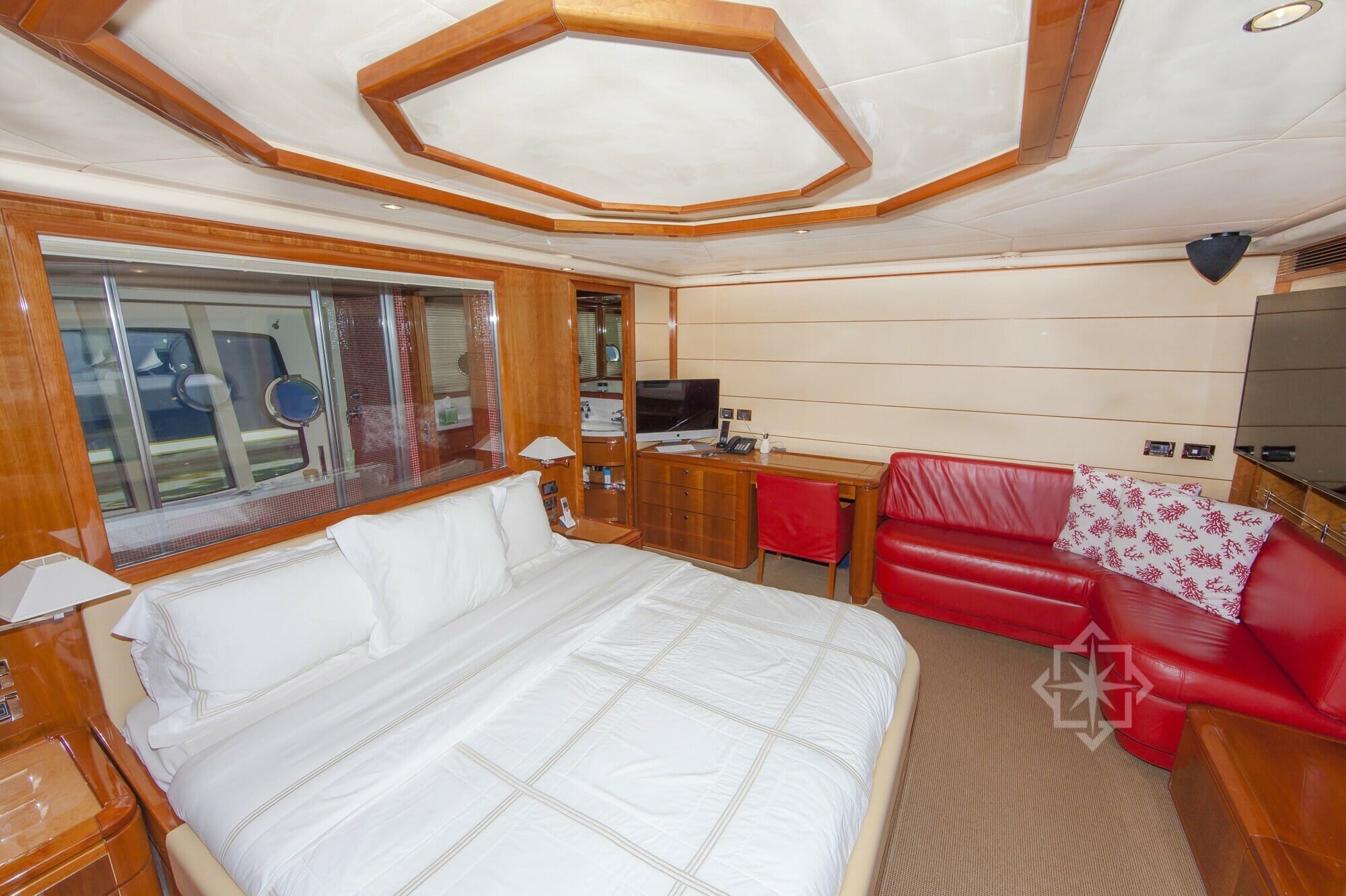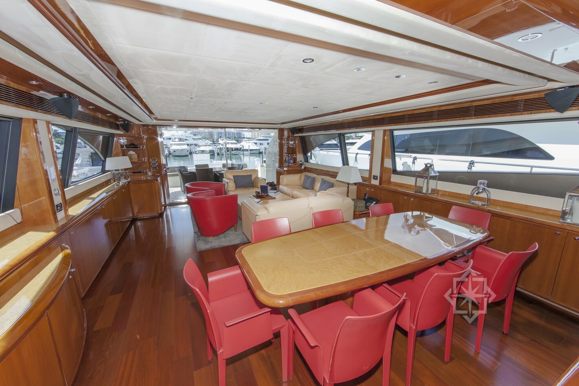 The interior of the yacht includes a well-appointed salon and a lovely dinning table for 8 guests. This yacht is also capable of accommodating up to eight guests in four staterooms; a Master stateroom with a king size bed, a VIP stateroom with a queen, and two twin cabins.
