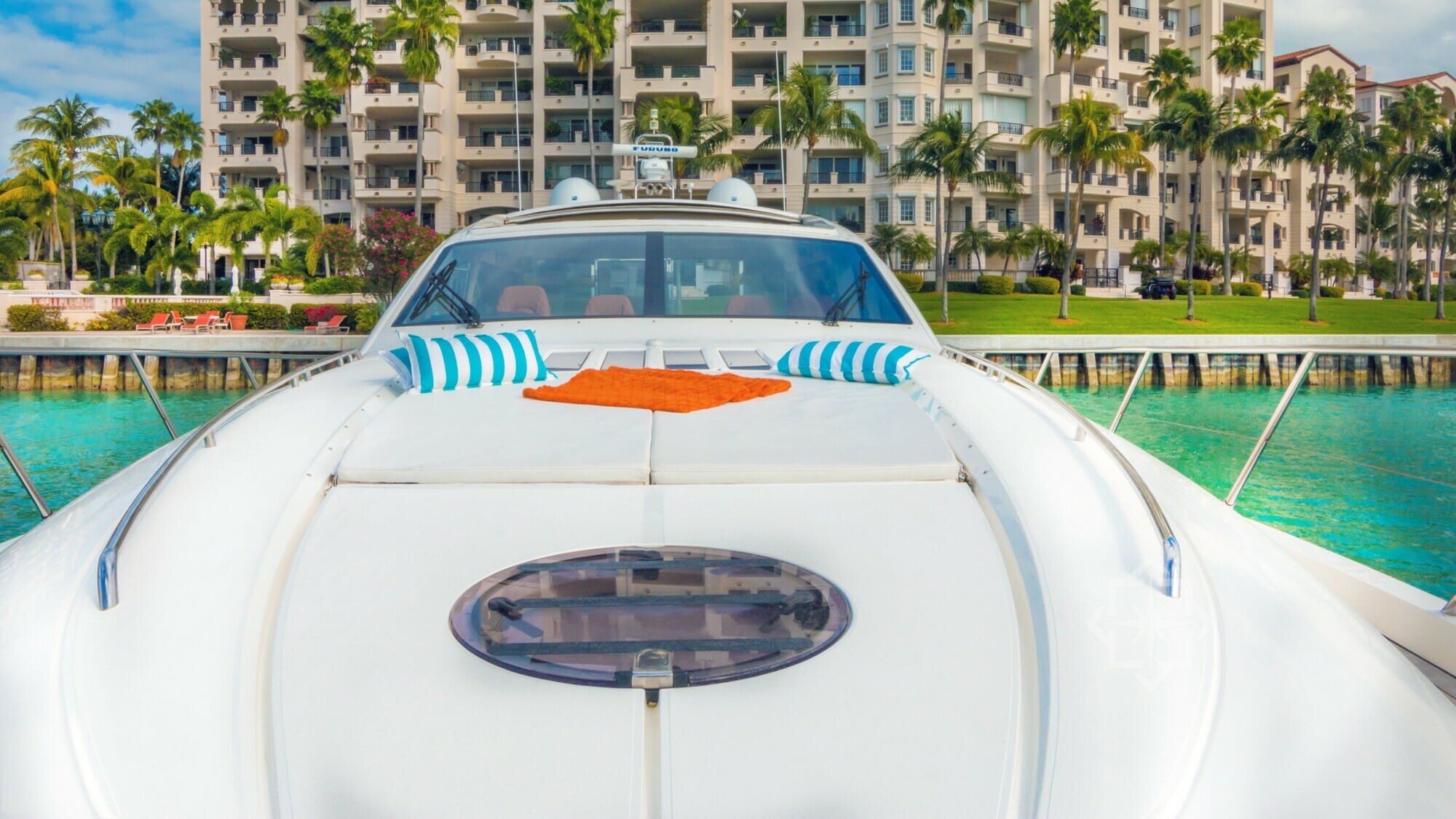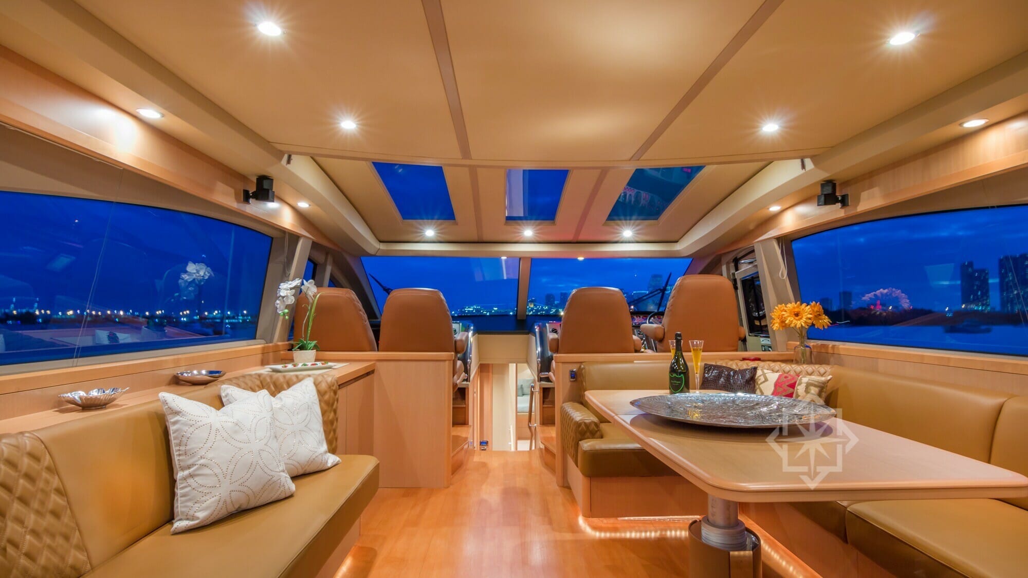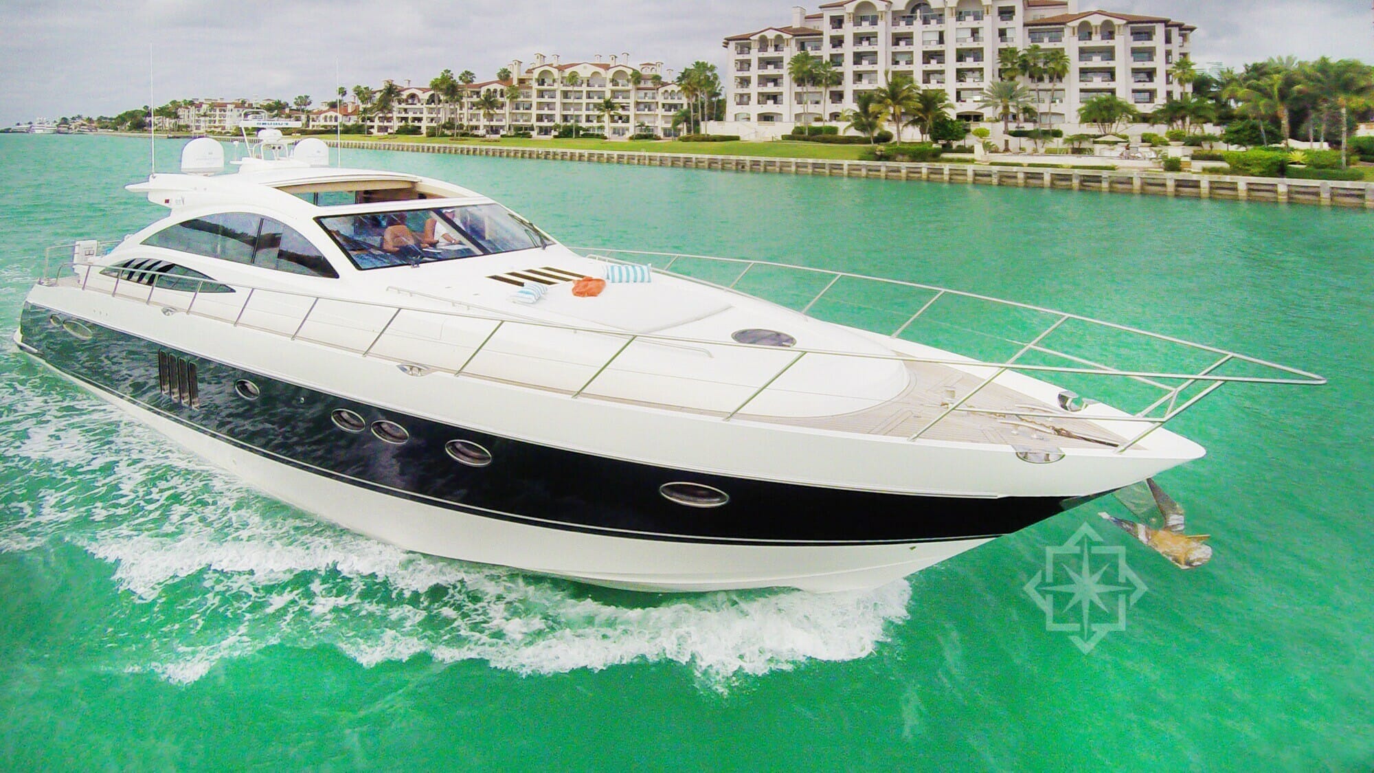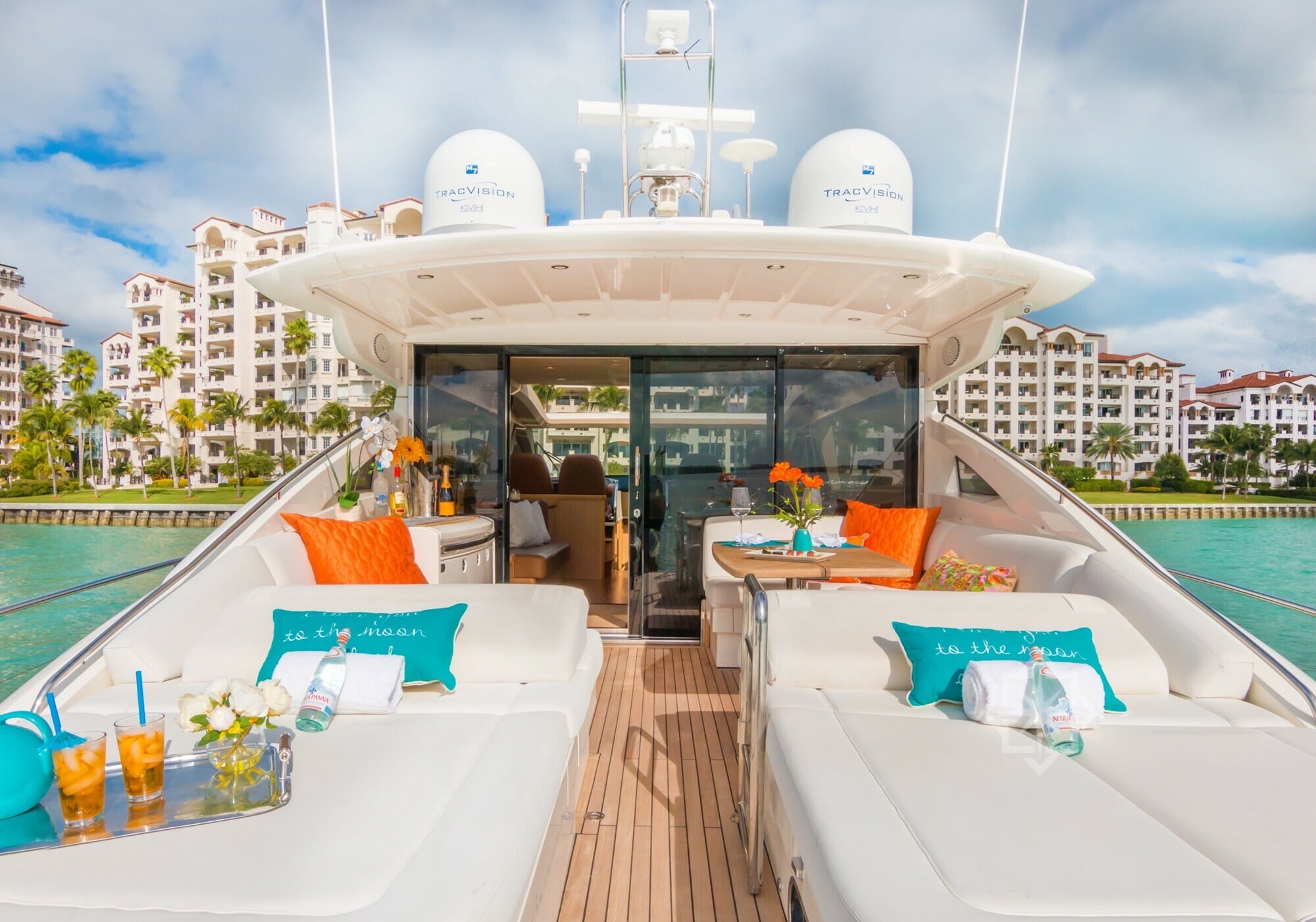 This luxurious Princess V70 has contemporary lines within a timeless design. A great option for your Miami yacht tours. The yacht offers a large salon with a retractable sunroof. The full salon comfortably can seat and dine more than 6 guests. Large panoramic windows allows you and your guests to lounge and enjoy the scenic views.The outer decks provide plenty of sunbathing areas and a nicely thought out dining area. For accommodations the yacht has a 3 staterooms, each with ensuite head layout, flat screen TVs and individual Bose stereo sound.
